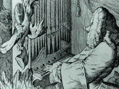 ehe er diese Karikatur veröffentlicht. Sie zeigt Händel mit Schweinsgesicht auf einem Weinfass an der Hausorgel, an der