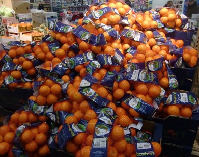 zwischen Auslagen mit Früchten und Gemüse auf dem Marktplatz
