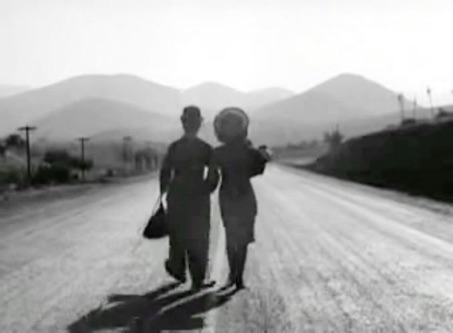 Paulette Goddard die Landstrasse davongeht, ist